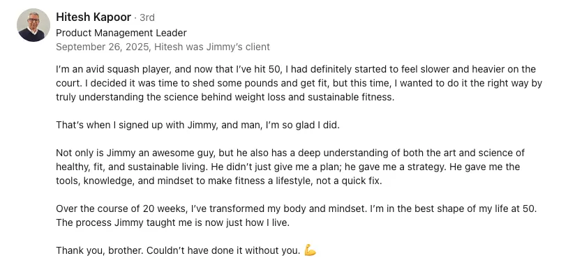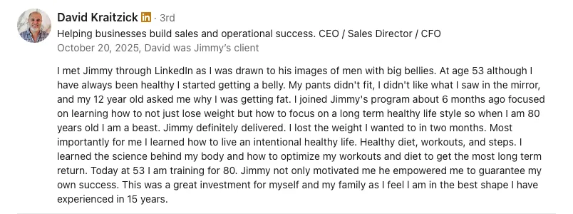 Results may vary. All testimonials are from real clients, but they represent the experiences of highly motivated individuals who followed the program with full commitment. Your results will depend on factors such as adherence, effort, consistency, and personal circumstances. Results are not guaranteed.